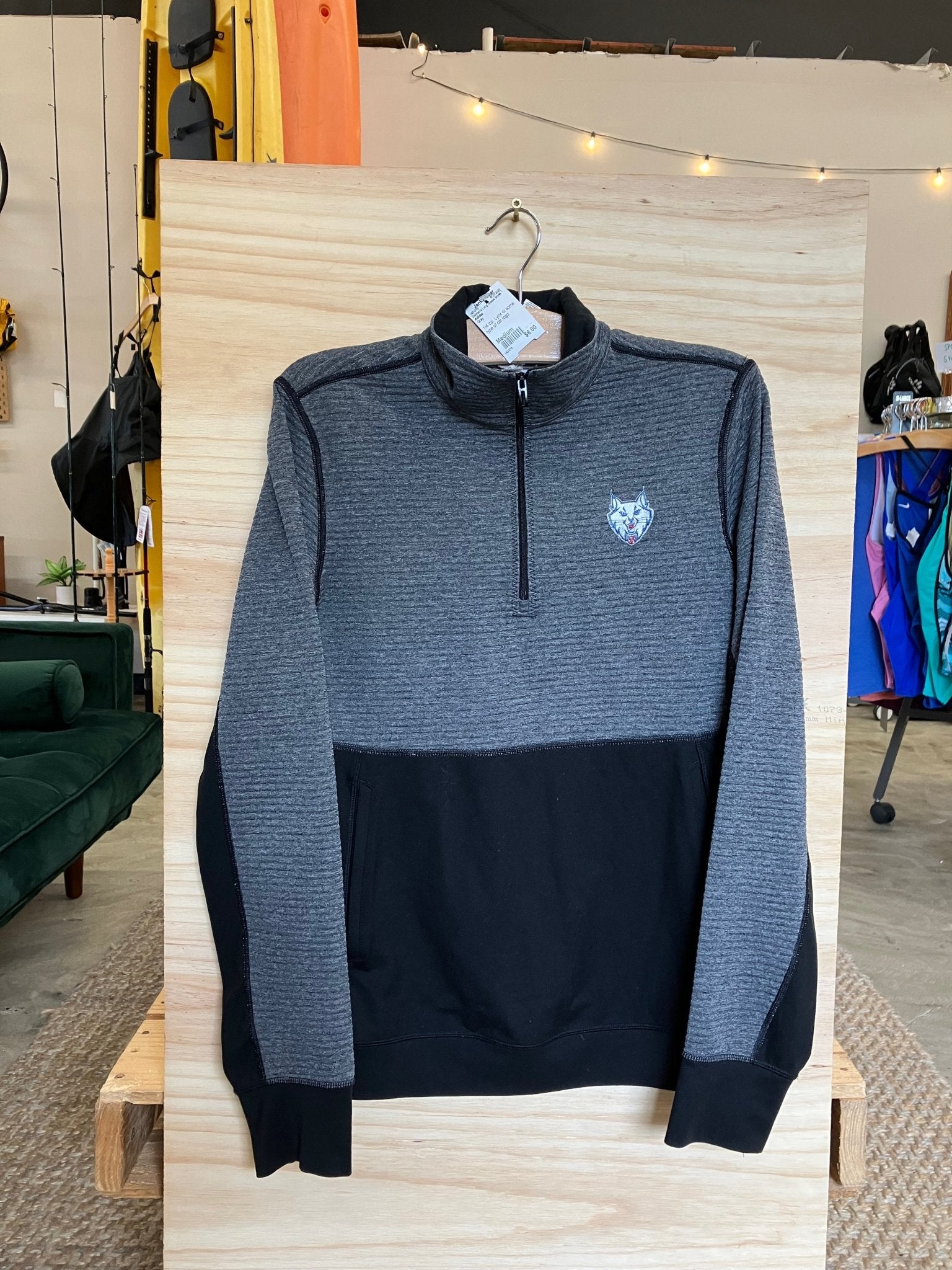 1/4 zip. Lynx or some type of cat logo.